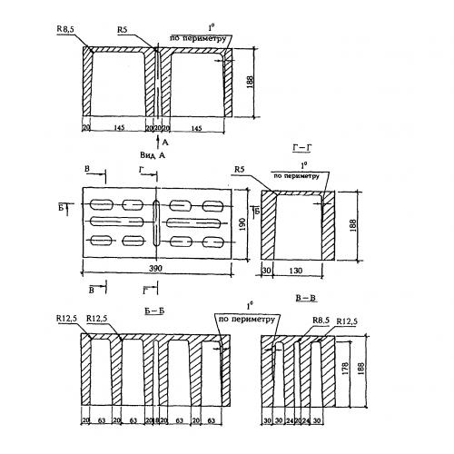 Камни для кладки стен КСР-ПР-ПС 39. Унифицированные изделия, имеющие прямоугольную форму с рядом конструктивных особенностей в виде выступов, углублений и отверстий.